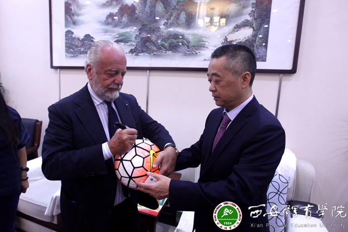 下午,学院与那不勒斯足球俱乐部访问团举行了见面会。院长周里、党政办主任张朝阳、足球改革发展办公室主任朱军、教务处处长高新友、足球教研室主任唐铁锋出席。见面会上,奥雷利奥•德•劳伦蒂斯向我院介绍了那不勒斯足球俱乐部的相关情况,并表示非常看重中国市场并支持中国“一带一路”发展战略,希望能借助“一带一路”带来的良好环境与我院未来在足球领域进行合作发展。周里向那不勒斯足球俱乐部访问团介绍了我院基本情况,重点介绍了学院足球发展情况和足球学院的办学思路和目标定位,并希望那不勒斯足球俱乐部能在足球教练员和足球专项学生互访、足球训练指导等方面给予支持和帮助。