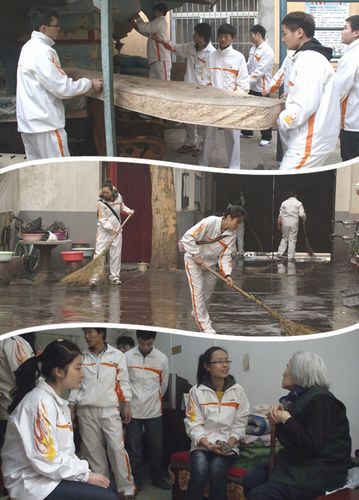 本网讯继3月5日举办了主题为“巩固创建文明校园成果,做新时期雷锋式大学生”活动之后,3月17日上午,运动训练系2009级30余名同学在辅导员老师的带领下,自带清洁工具,来到西安市碑林区民政局文艺路街道办金秋老年公寓进行学雷锋献爱心活动,为老人们擦玻璃,扫地,洗衣服,收拾杂物等。同学们还带去了精心准备的节目,包括歌唱、舞蹈、太极拳、跆拳道、健美操等表演,给老人们带去了欢乐,带去了温暖。