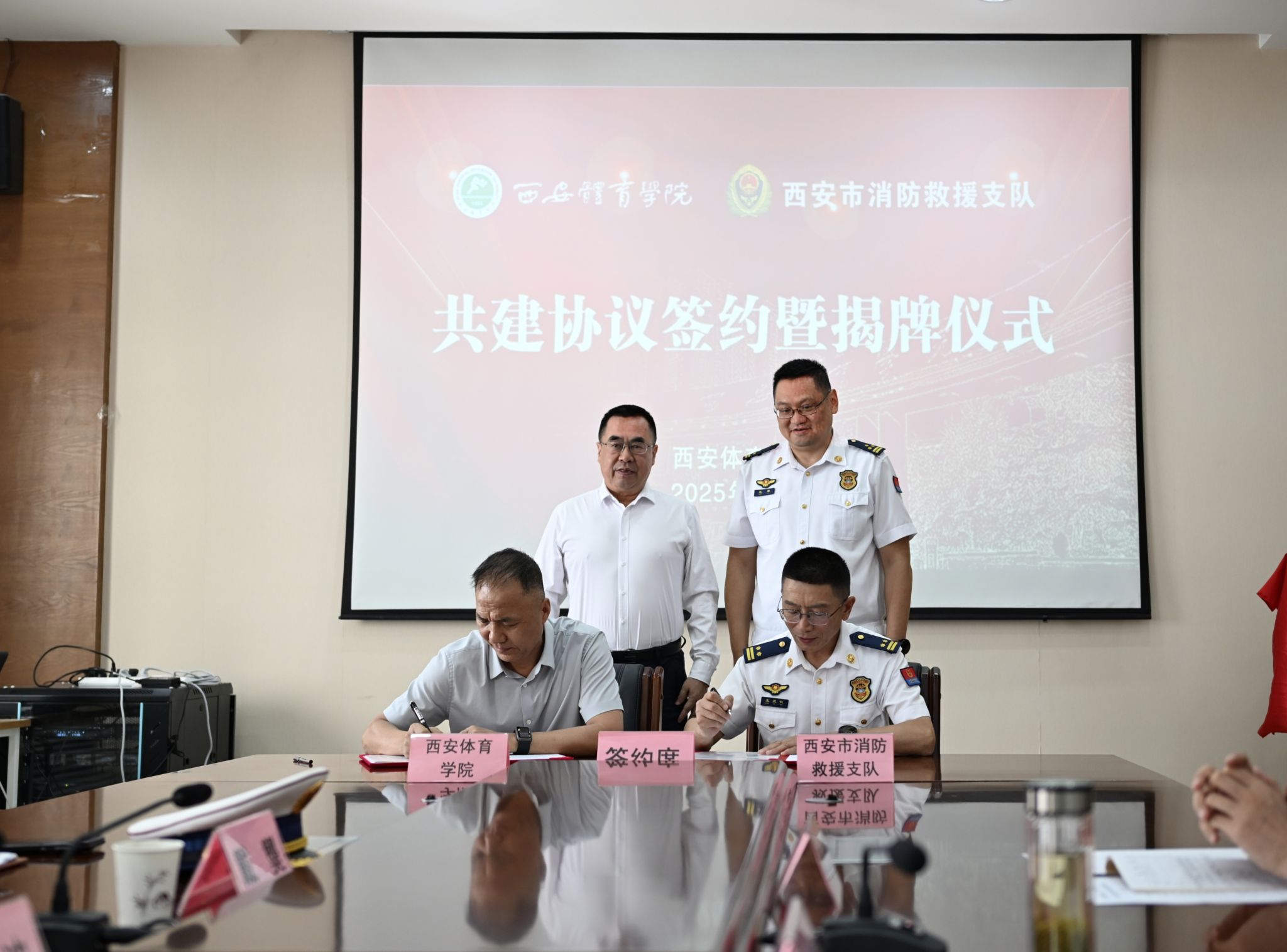 本网讯 9月8日,我校与西安市消防救援支队举行战略合作签约仪式暨“体消联动实验室”揭牌仪式。西安市消防救援支队党委副书记、支队长赵璐,支队政治部主任夏波,副支队长王昱钦出席。我校校长李富生主持会议并讲话,副校长雷振华出席。双方相关部门负责人一同参会。