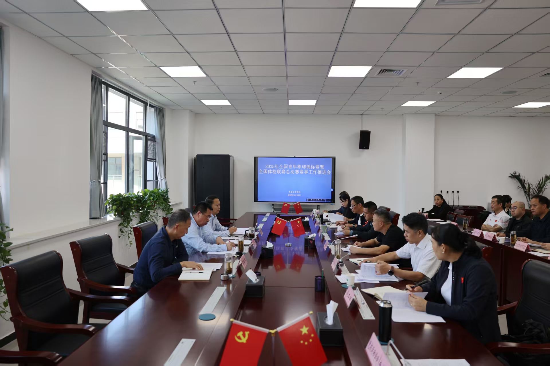 本网讯 9月19日,2025年全国青年棒球锦标赛暨全国体校联赛总决赛筹备工作推进会在鄠邑校区召开。校长李富生主持会议,党委副书记马海涛、副校长雷振华出席,各相关部门、学院负责人参加会议。