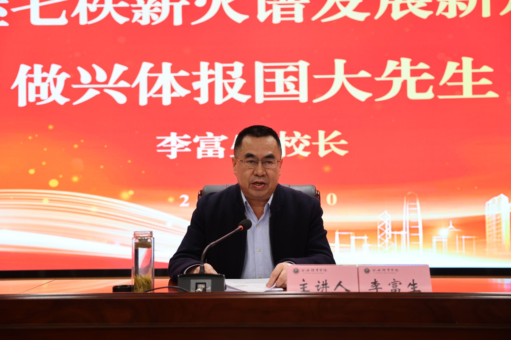 李富生以《赓续七秩薪火 再谱发展新篇——做兴体报国大先生》为题,深情回顾了学校71年来与党和国家同向同行的奋斗历程,全面总结了近年来学校在基建提速、战略西迁、人才培养模式改革、特色项目建设和体教融合等方面取得的成绩,展现了新时代西体人勇立潮头、守正创新的昂扬姿态。他强调,作为新时代的青年教师,要在西体厚重的历史积淀和改革实践中汲取力量,把个人成长融入教育强国、体育强国、健康中国的宏伟蓝图。他以“立德、砺能、创新、奉献、报国”五个关键词寄语新教师:一要立“信念”之德、“操守”之德,做信仰坚定、师德高尚的“擎旗手”,筑牢育人之魂;二要锤炼教学真功、勇攀科研高峰、提升综合素养,做业务精湛、能力过硬的“实干家”,夯实从业之基;三要勇于解放思想,做守正创新、自信自立的“开拓者”,激发奋进之源;四是树立主人翁意识,做爱校荣校、甘于奉献的“主人翁”,涵养情怀之根;五是心怀“国之大者”,做胸怀天下、矢志报国的“追梦人”,践行时代之命。