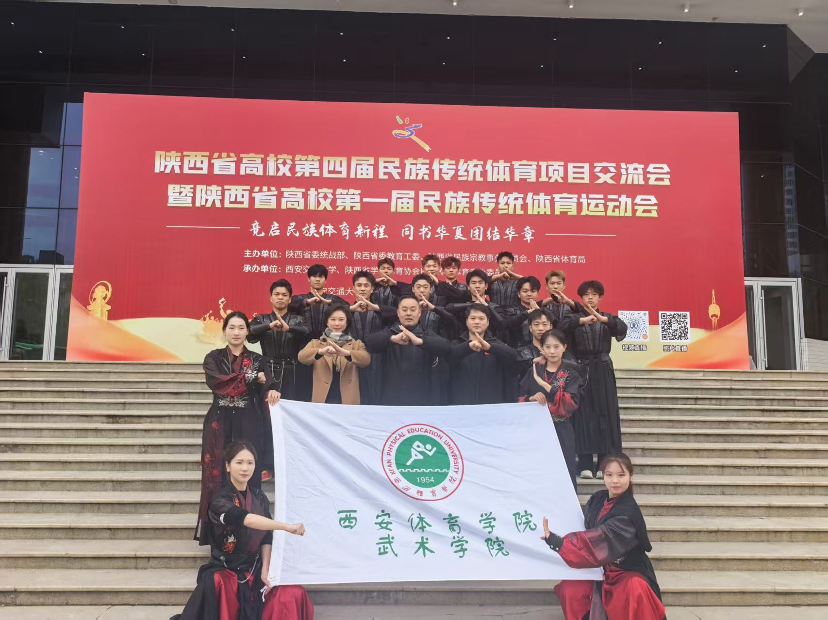 本网讯 11月8日,由陕西省委统战部、省委教育工委、省民族宗教事务委员会、省体育局联合主办的陕西省高校第四届民族传统体育项目交流会暨陕西省高校第一届民族传统体育运动会在西安交通大学兴庆校区举行,共有全省52所高校的1250名运动员同台竞技。我校武术学院的集体武术表演《秦风武韵》凭借其精湛的技艺和深厚的文化内涵,在众多参赛节目中脱颖而出,荣获表演项目一等奖。