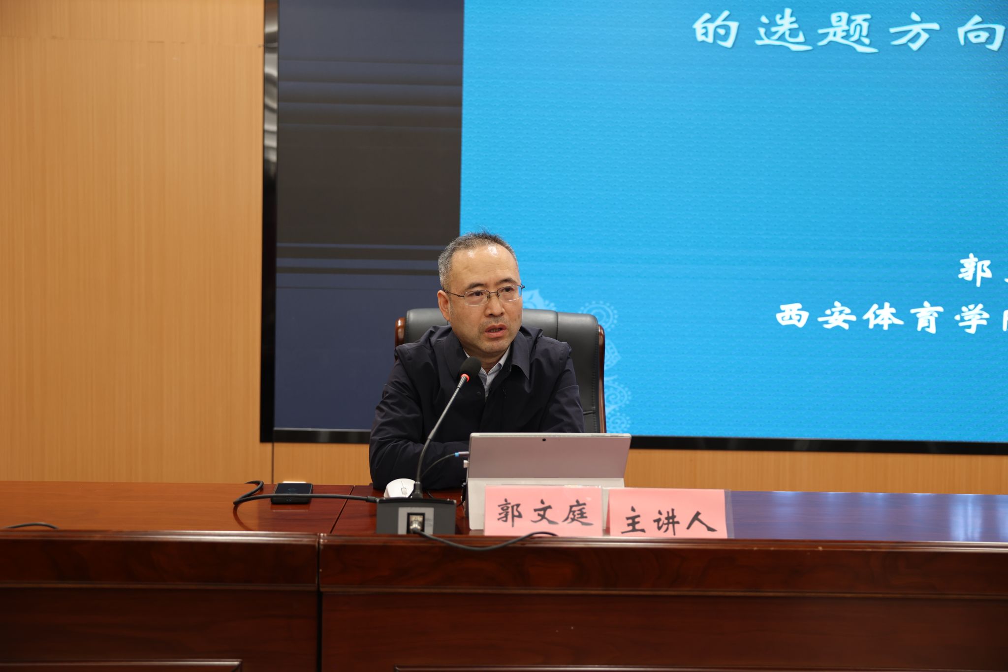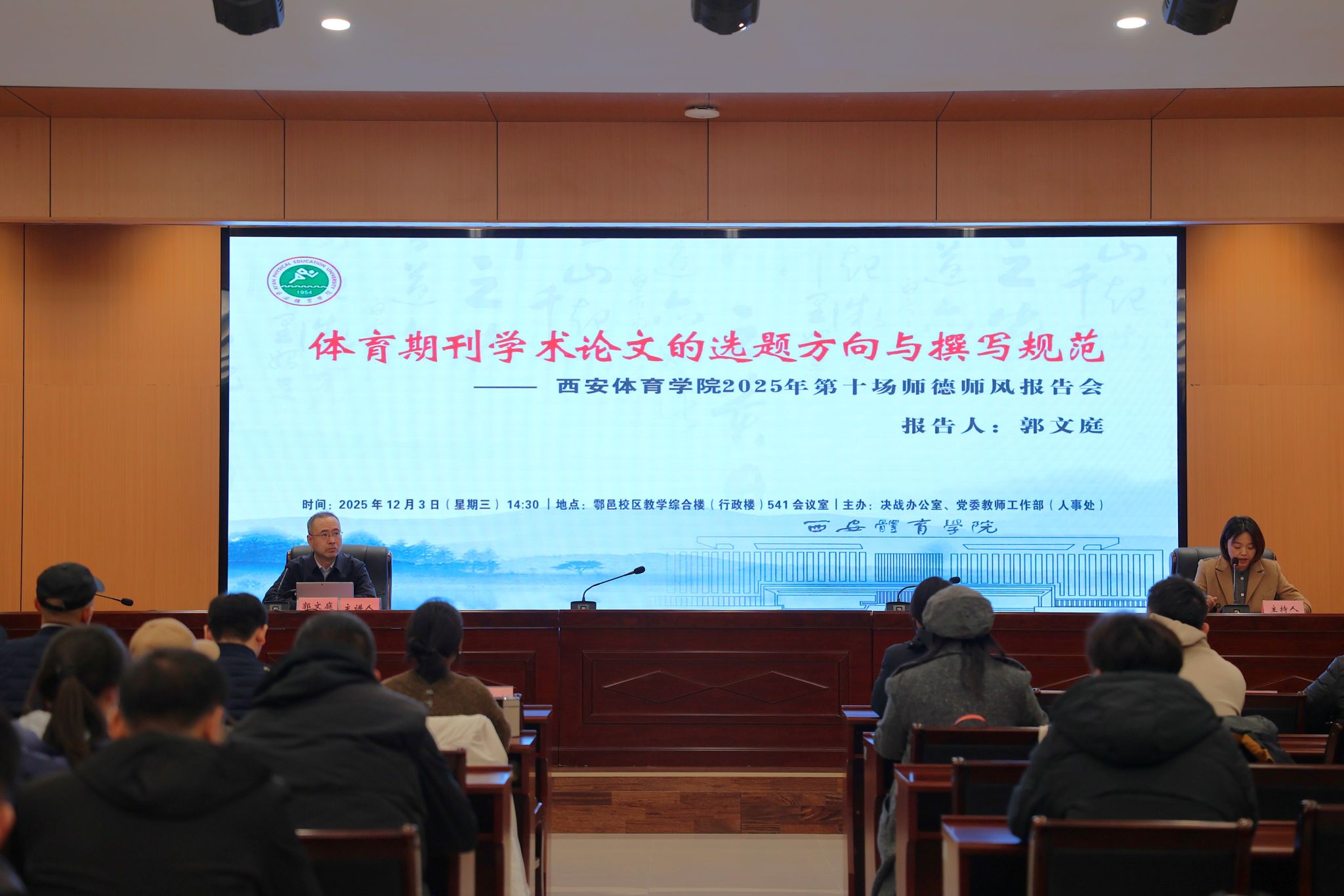 本网讯 为深入贯彻落实教育家精神,持续推进学校师德师风建设常态化、长效化,12月3日下午,我校在鄠邑校区举办第十场师德师风报告会。学报编辑部主任郭文庭教授主讲,作题为《体育期刊学术论文的选题方向与撰写规范》的专题报告,本次活动由党委教师工作部(人事处)主办,各二级学院党政负责人及教师代表共120余人参会。