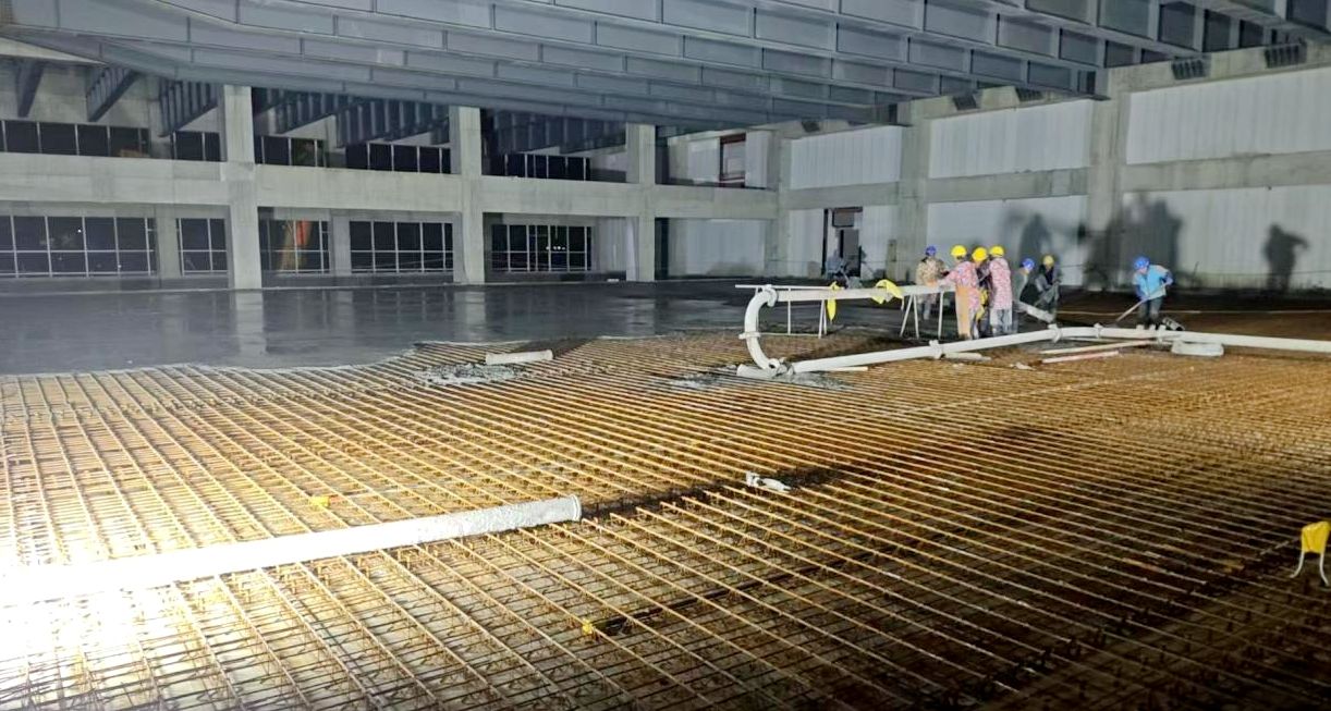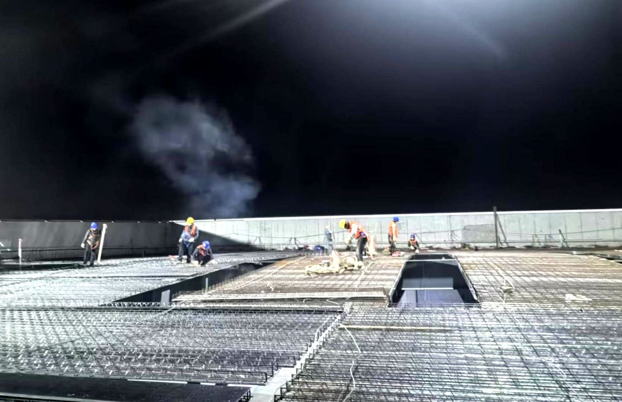 当前项目已进入结构施工关键阶段,此次夜间施工聚焦多项核心任务:南区三层混凝土浇筑现场,输送泵车精准作业,施工人员轮流值守把控浇筑厚度与振捣质量,确保结构强度达标;五层11~13轴/b-d轴及屋面对应区域的楼承板安装现场,施工人员默契配合,精准定位板材、紧固连接件,为后续施工筑牢基础;楼承板栓钉焊接工位上,焊花在夜色中闪烁,技术人员严格把控焊接温度与深度,保障钢结构与楼承板的牢固衔接;钢筋绑扎区域内,工人们精准排布钢筋,绑扎间距均匀、节点牢固,为工程结构安全筑牢“钢筋铁骨”。