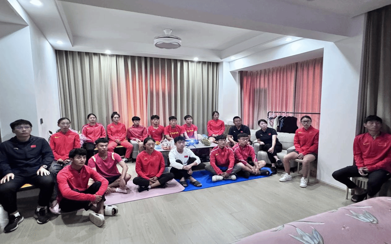 在国家队训练场地,竞走队队员们同步观看纪念大会。训练的疲惫在历史的震撼与精神的感召下,化作了更强劲的拼搏动力。