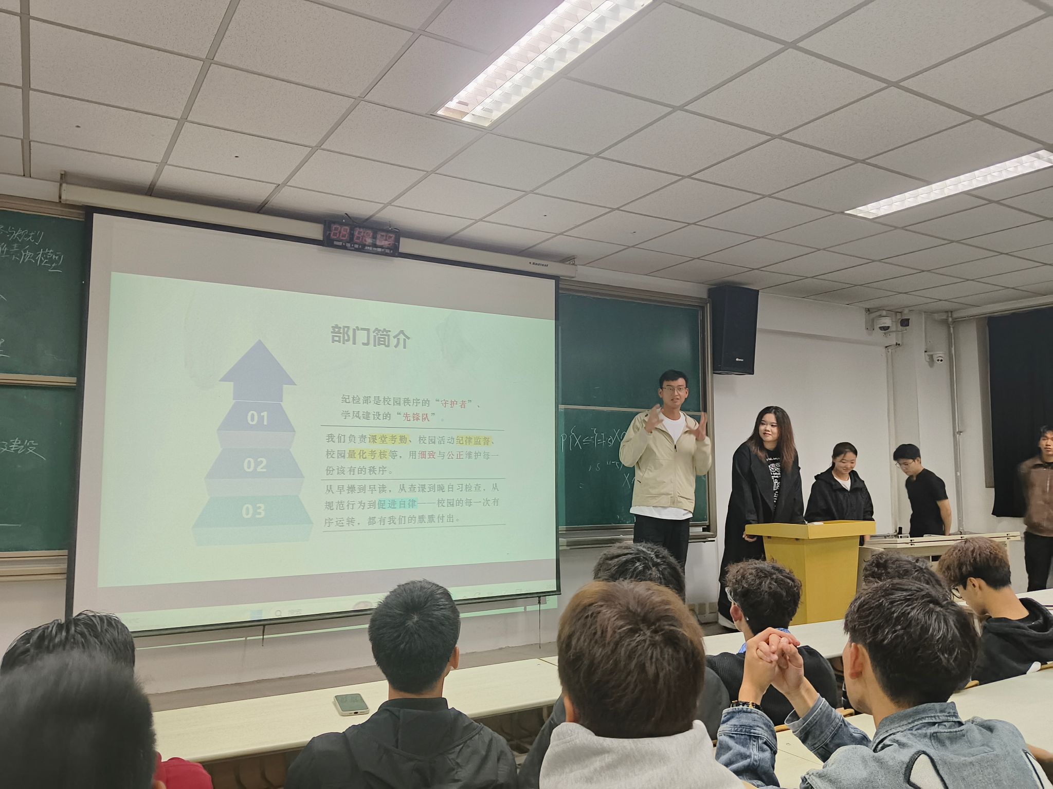 纪检部:致力于维护学院纪律秩序,营造自觉守纪、团结友善的校园氛围。具体负责监督课堂、早读、早操的出勤;保障晚会、集会等大型活动的现场秩序;完成学生日常行为评定;积极配合老师及其他部门完成辅助管理任务,是学院治理体系中重要的一环。