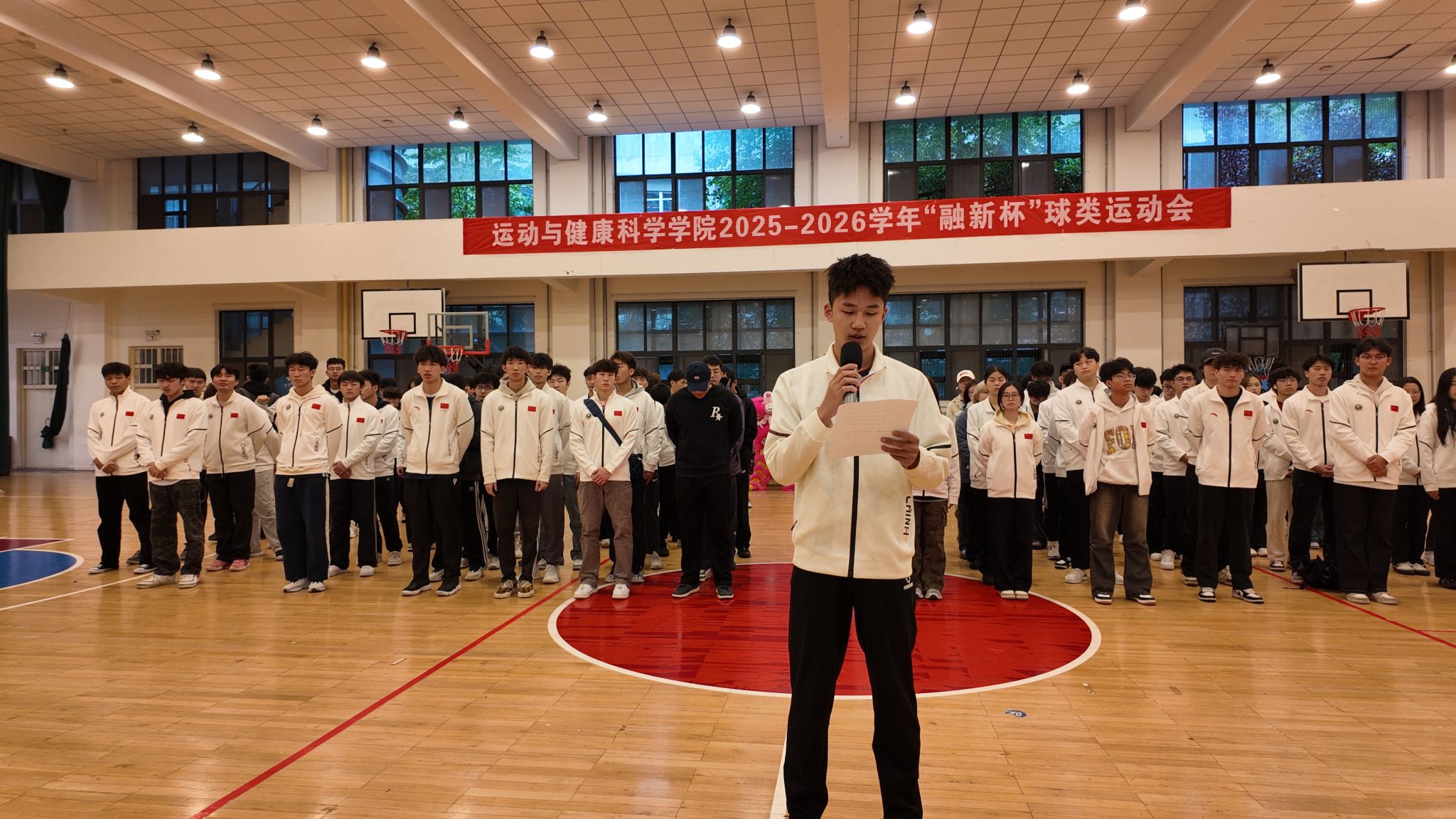 秋意渐浓,激情不减。10月17日中午,西安体育学院篮排馆内气氛热烈,运动与健康科学学院“融新杯”开幕式在此隆重举行。师生齐聚,活力迸发,共同见证这场属于青春与运动的盛宴。