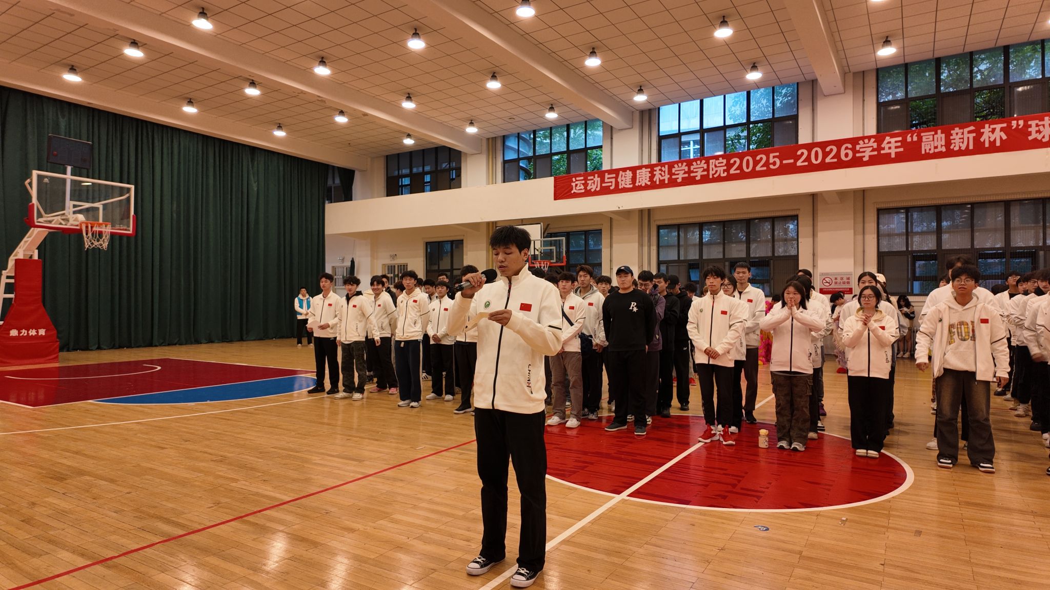 在热烈的氛围中,运动与健康科学学院院长刘军为比赛开球。一颗篮球的抛起,象征着“融新杯”的正式启动,也点燃了每一位参赛选手心中的战火。