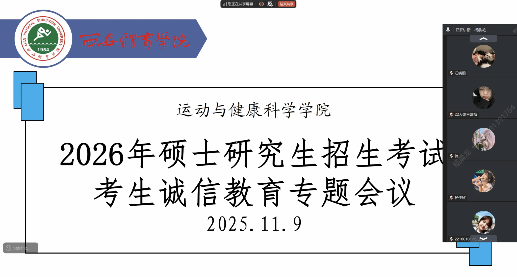 为引导 2026 年硕士研究生招生考试备考学子树立诚信应考意识,筑牢学术道德底线,帮助同学们明确考试纪律要求、调整备考心态,11月9日晚7点,2022级辅导员杨晨龙通过腾讯会议平台,面向全院 2022 级考研备考同学召开硕士研究生招生考试考生诚信教育专题会议,为即将踏上考研征程的学子们送上 “诚信备考指南”。
