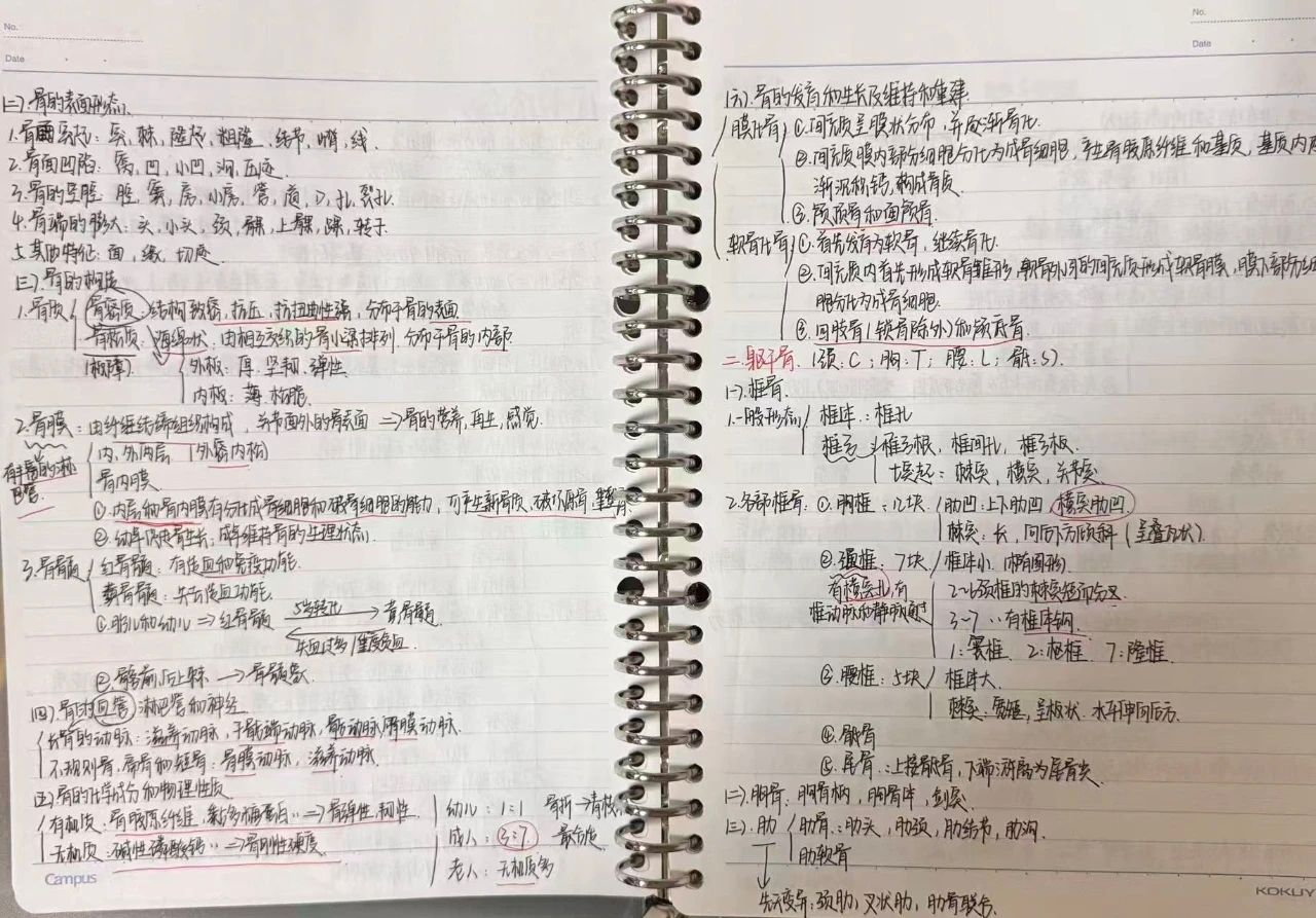 没有多余色彩堆砌,却凭极致条理惊艳全场——核心重点用醒目符号精准锚定,延展内容紧跟其后,知识点层级划分清晰,逻辑框架层层递进。复杂的解剖图示与专业内容被梳理得一目了然,字里行间满是对知识的用心琢磨,每一处标注都藏着“化繁为简”的巧思。