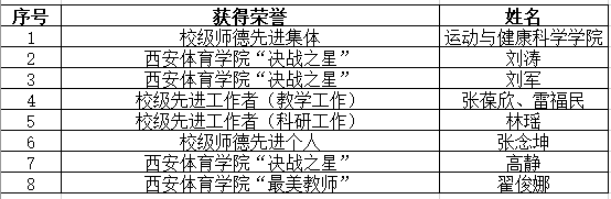 在2025年9月10日西安体育学院第41个教师节表彰大会上,运动与健康科学学院被授予“校级师德先进集体”称号,并成为本年度全校唯一获此殊荣的学院。张念坤教师获校级师德先进个人,翟俊娜教师获校级“最美教师”称号,刘涛、刘军、高静三位教师获“决战之星”称号,林瑶教师获校级先进工作者(科研工作),张葆欣、雷福民两位教师获校级先进工作者(教学工作)。