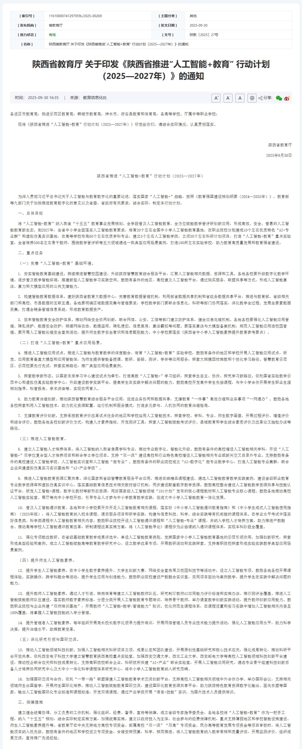 陕西省教育厅关于印发《陕西省推进“人工智能+教育”行动计划(2025—2027年)》的通知