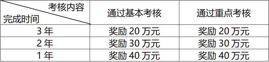 A、B、C、D类高层次人才:若5年完成首轮聘期10年的考核任务,按5年合同薪酬总额的50%,予以一次性奖励;若3年完成首轮聘期10年的考核任务,按5年合同薪酬总额的100%,予以一次性奖励。考核任务完成后,首轮聘期提前结束,签订下一个聘期合同。