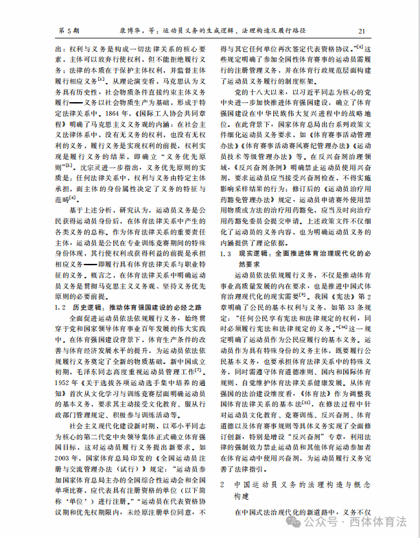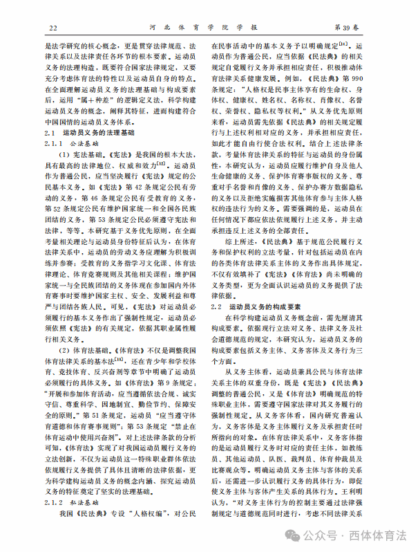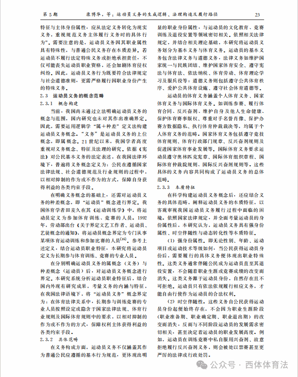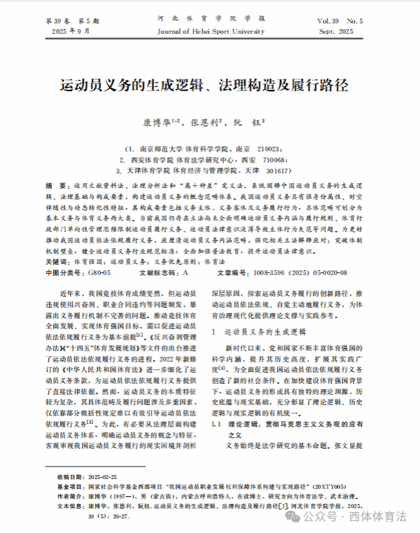 近日,西安体育学院体育法学研究中心研究员康博华在河北体育学院学报第五期发表了题为《运动员义务的生成逻辑、 法理构造及履行路径》研究成果。