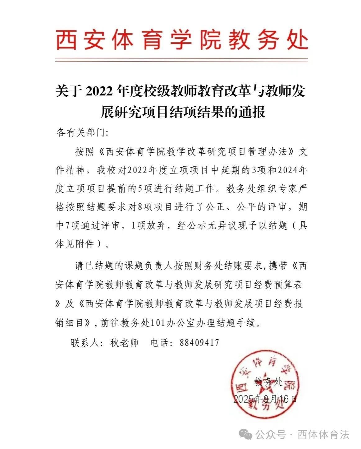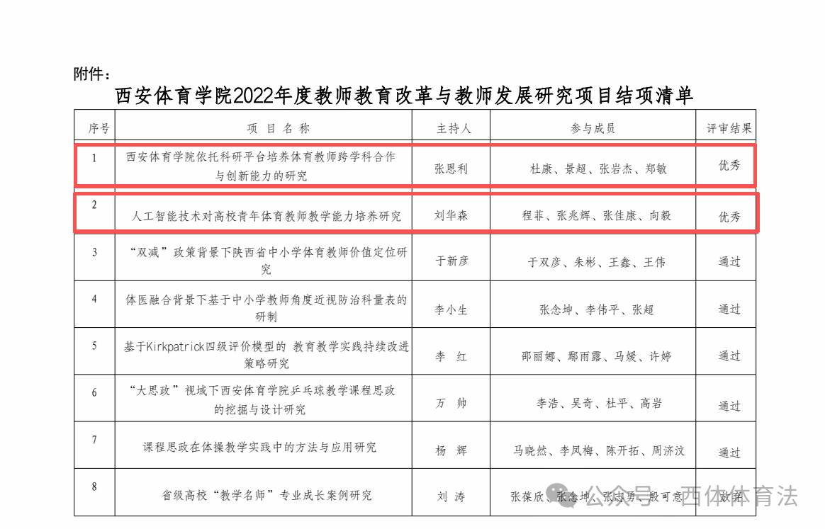 近日,西安体育学院公布2022年度校级教师教育改革与教师发展研究项目结项名单,体育法学研究基地张恩利和刘华森两位老师主持的教师教改项目顺利结题并获评优秀结果。