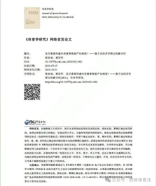 西安体育学院体育法学研究中心研究员、安徽师范大学硕导蒋亚斌博士在《体育学研究》发表最新研究成果