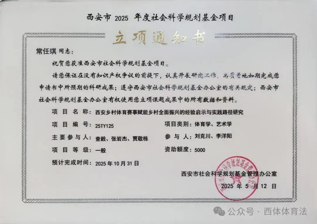体育法学研究中心研究员、西安文理学院常任琪副教授获批2025年度西安市社会科学规划基金项目立项