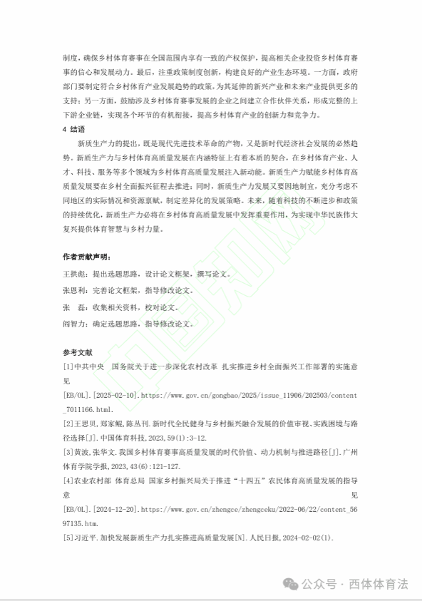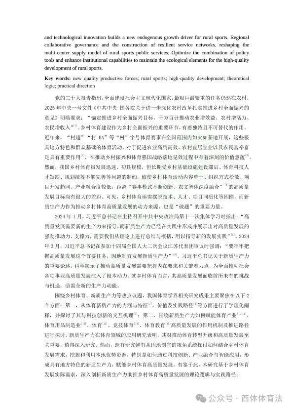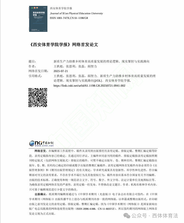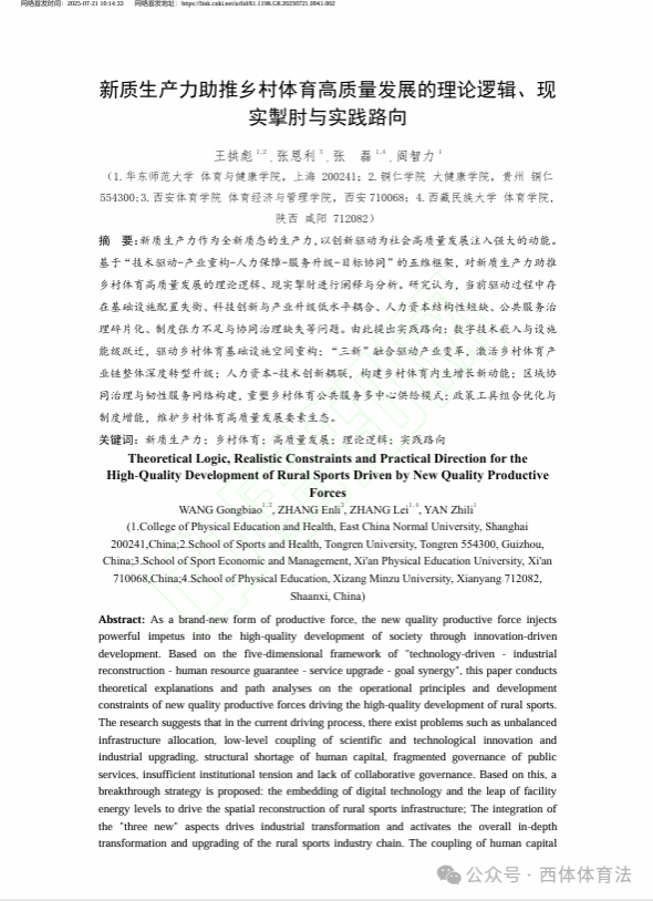 近期,体育法学研究中心研究员王拱彪教授在《西安体育学院学报》发表了题为《新质生产力助推乡村体育高质量发展的理论逻辑、现实掣肘与实践路向》的研究成果。
