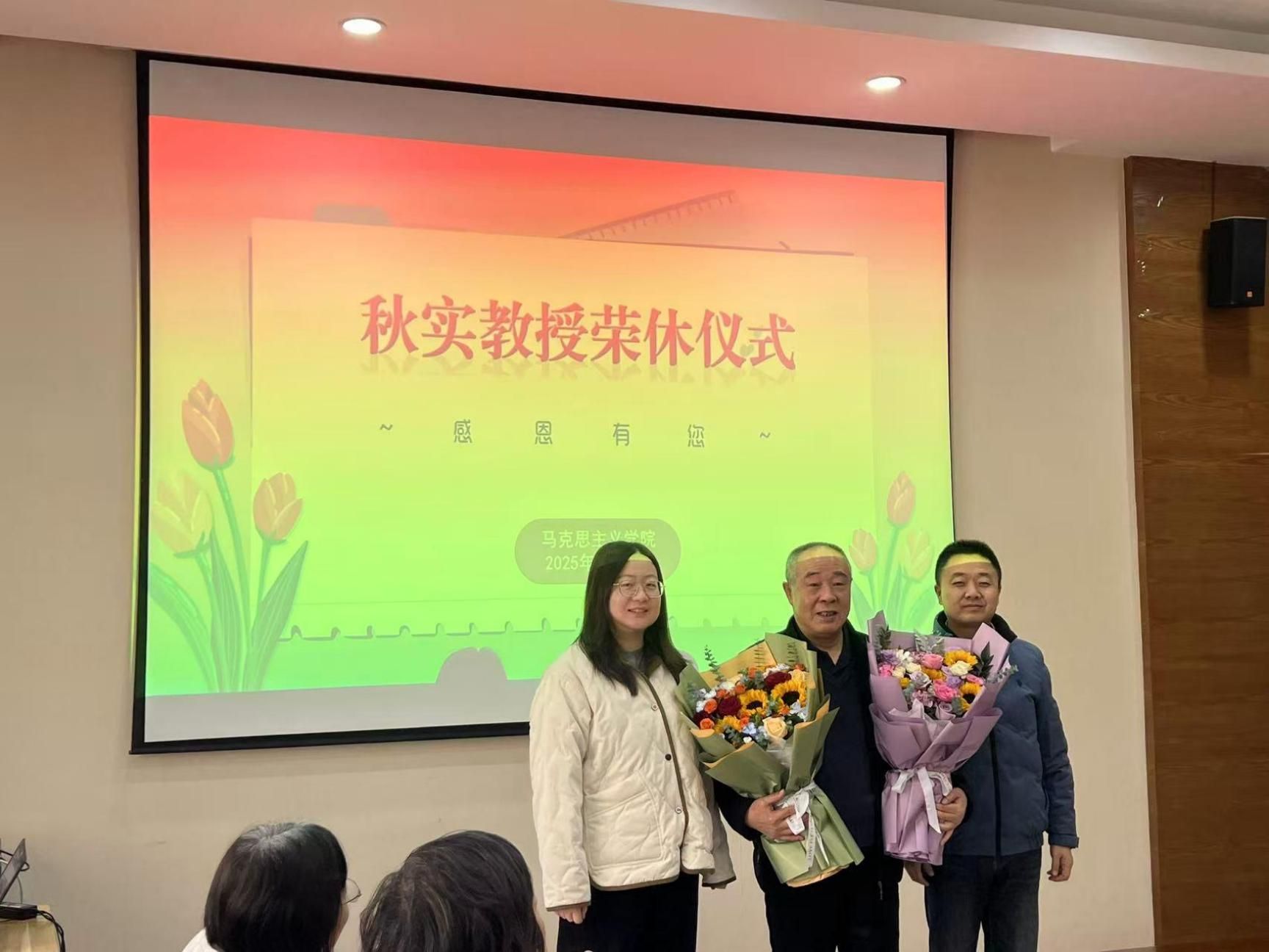 仪式上,张彩红首先在致辞中回顾了秋实教授的光辉历程,高度赞扬其“功成不必在我”的胸襟与“功成必定有我”的担当,并代表全院师生表达由衷的敬意与不舍。退休不是终点,而是新旅程的起点。秋实教授的精神与贡献将永远铭刻在马院的发展历程中,学院也将继续关心他的退休生活,期待他常回“家”看看,为学院发展继续建言献策。