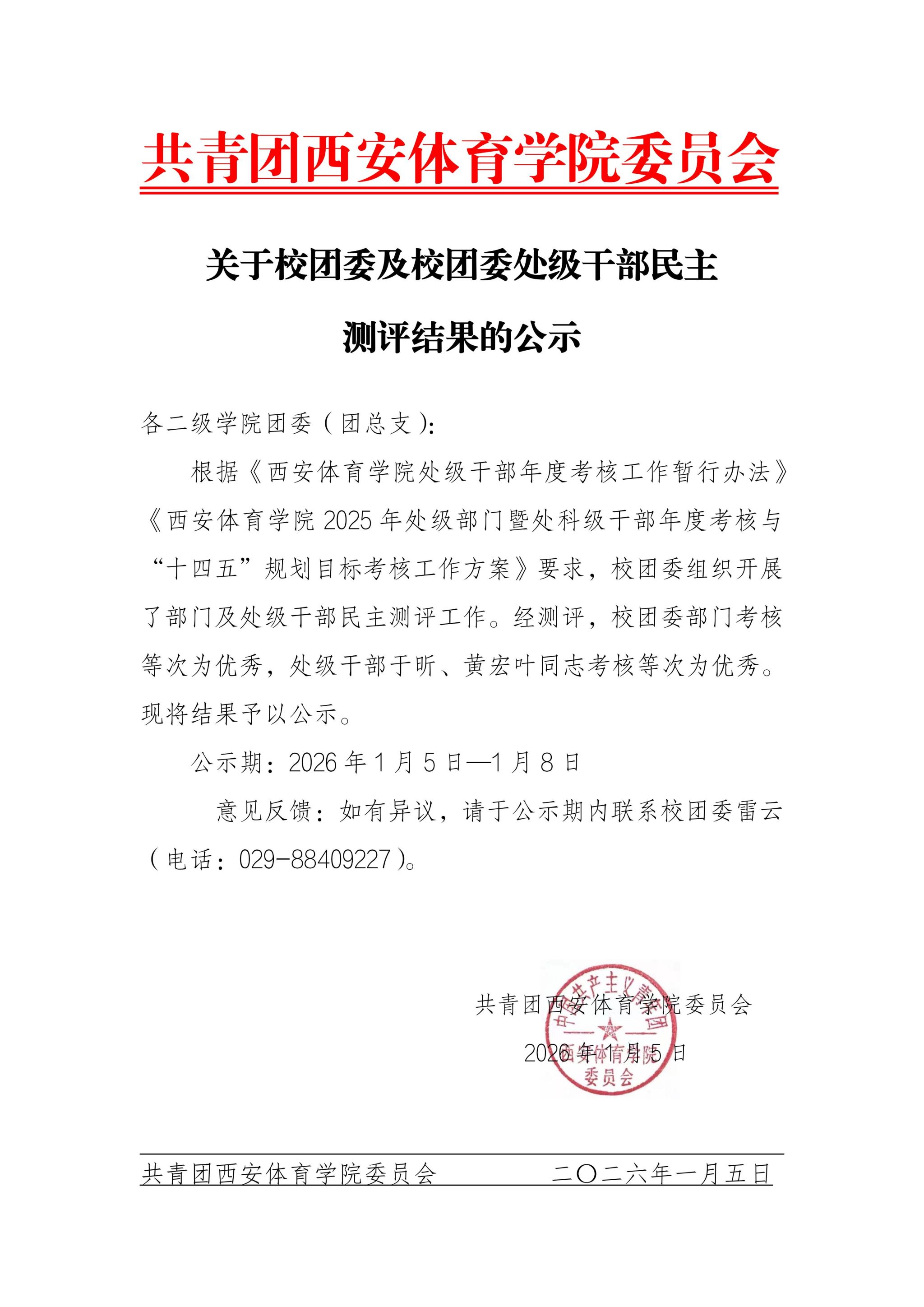 关于校团委及校团委处级干部民主测评结果的公示