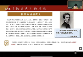魏鹏娟教授首先介绍民法典的地位:《中华人民共和国民法典》是新时代我国社会主义法治建设的重大成果,是新中国成立以来第一部以“法典”命名的法律,开创了我国法典编纂立法的先河。《民法典》无时无刻不在我们身边,可以说,人的利益延伸多远,民法的关爱就延伸多远。《民法典》被称为"社会生活百科全书"。民法典构建了完善的权利种类,健全了权利保护和救济的规则,对民事主体的人格权、人身权和财产权都作出了周密的制度安排,形成了完备的民事权利体系。之后,魏老师《民法典》的体系和内容进行了介绍,包括: 总则编通过提取公因式的方式,规定了有关民事权利的共通性规则,包括权利的主体、权利的发生、权利的限制等。第二编至第六编,这五编规定了各种具体民事权利,包括物权(物权编)、合同债权(合同编)、人格权(人格权编)、婚姻家庭中的身份权(婚姻家庭编)、继承权(继承编),是对人民群众所能享有的民事权利类型及内容的详尽规定。最后是侵权责任编,规定的是民事权利受侵害后的法律救济。