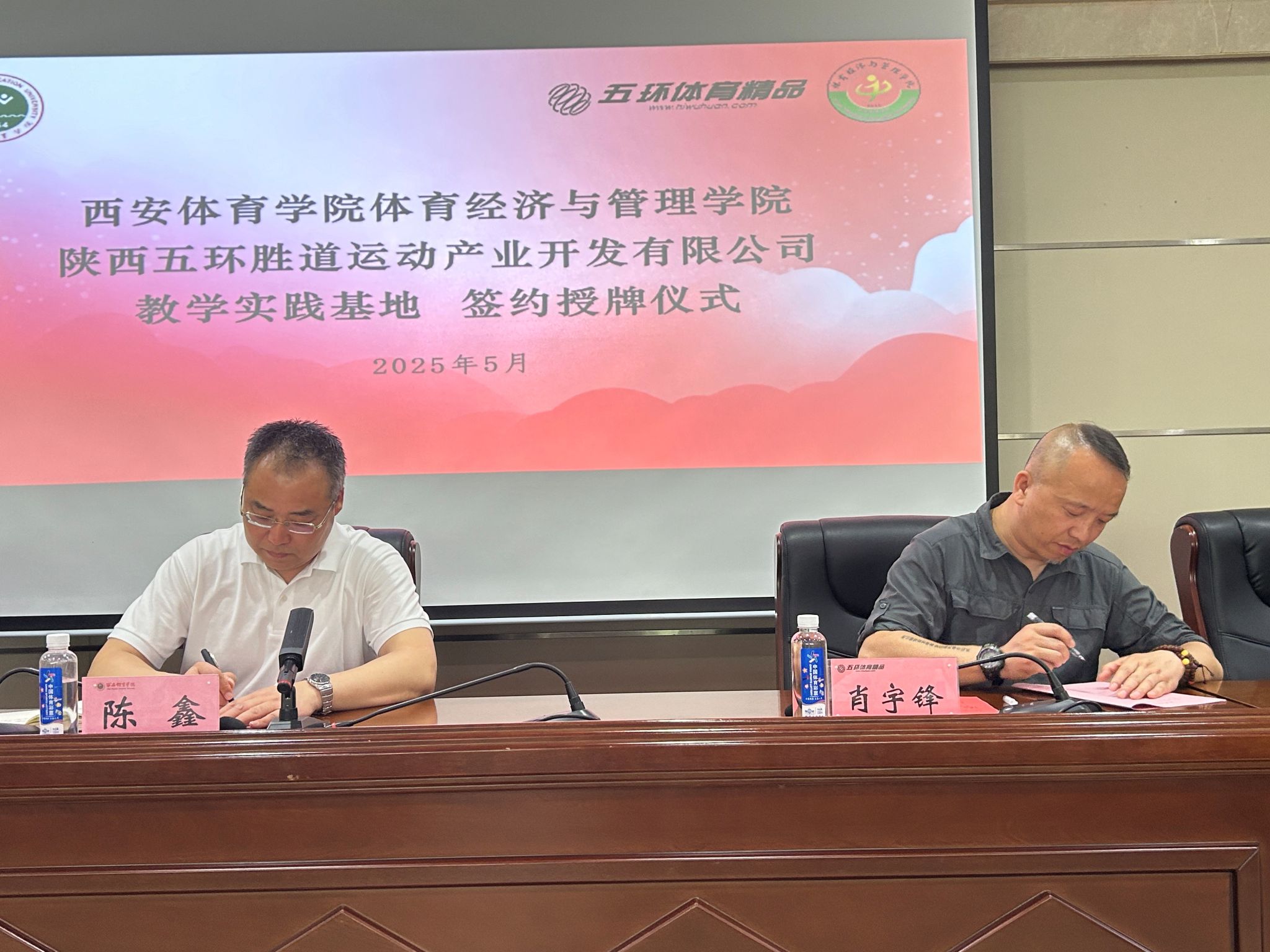 会议第三项,在众人的见证下,体育经济与管理学院与陕西五环胜道运动产业开发有限公司正式签署《教学实践基地共建协议》,并举行授牌仪式,标志着双方合作进入全新阶段。