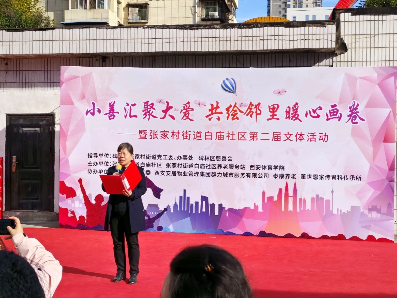 2025年11月19日下午两点,“小善汇聚大爱,共绘邻里暖心画卷”张家村街道白庙社区第二届文体活动隆重举行。本次活动是西体经管学院师生第三次联合碑林区张家村街道办共同举办。活动的核心环节——趣味运动会由经管师生负责策划组织实施的。穆晓、郑婧、魏鹏娟等多名老师参与对学生的指导和活动组织中。西体经管24学生赵嘉颖受邀共同主持此次社区文体盛会。