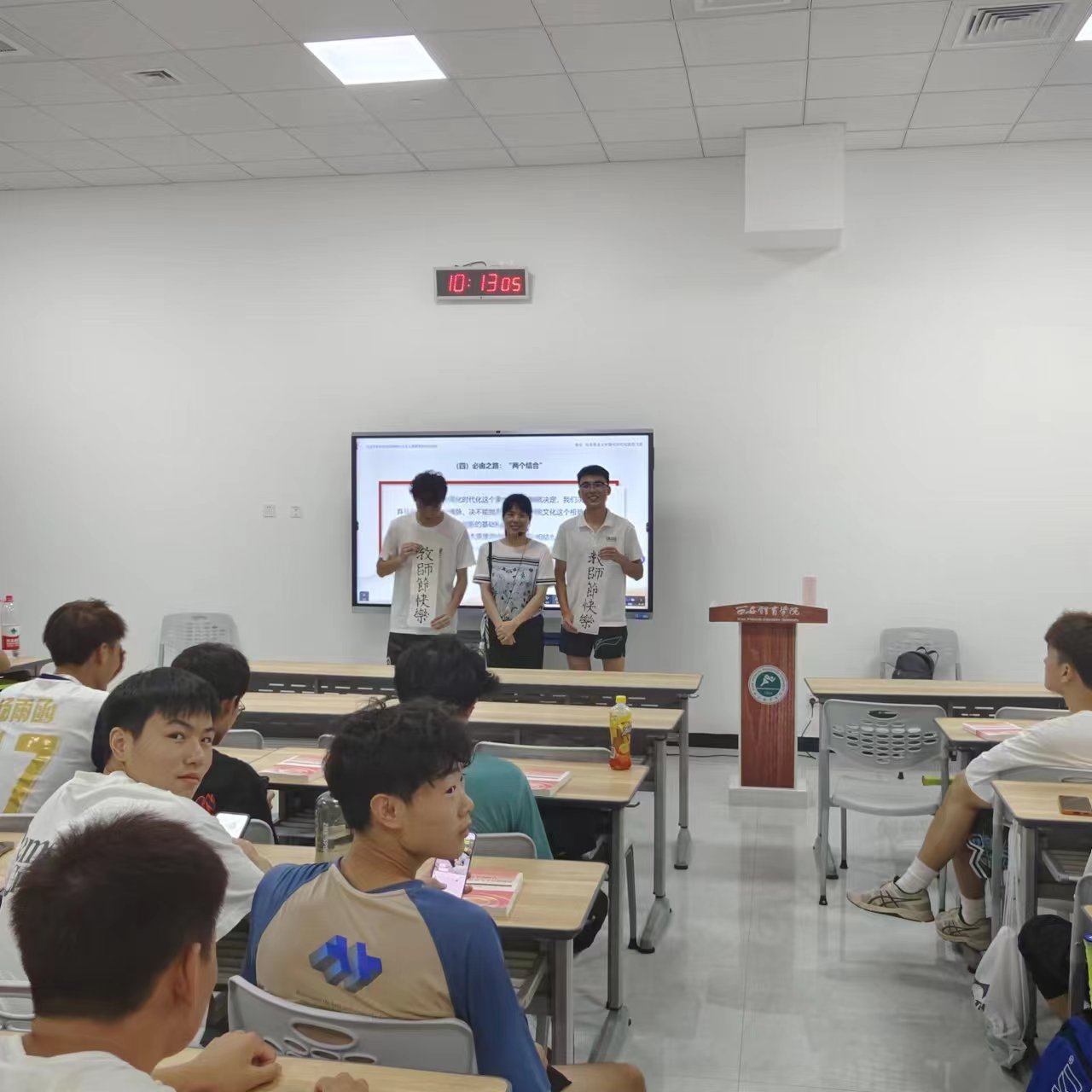 在第39个教师节来临之际,体育教育学院体育教育专业2021级、2022级,特殊教育专业2022级于9月8日开展了“送心意,表感恩”教师节主题活动。各班同学们通过自制贺卡、手写祝贺条幅、向老师献花,集体向老师道出“教师节快乐”,向老师敬礼等方式,表达对老师的感恩之情。
