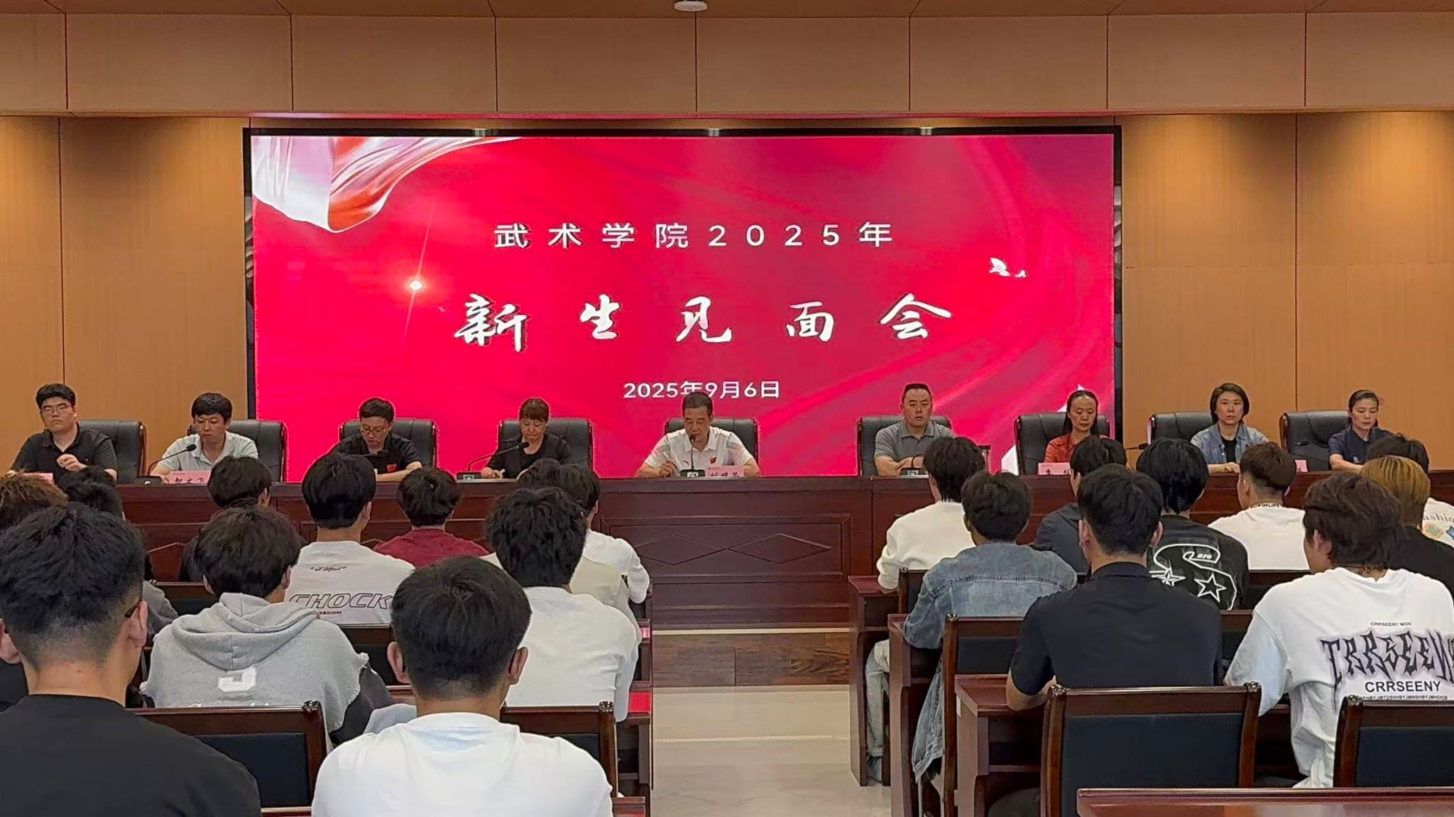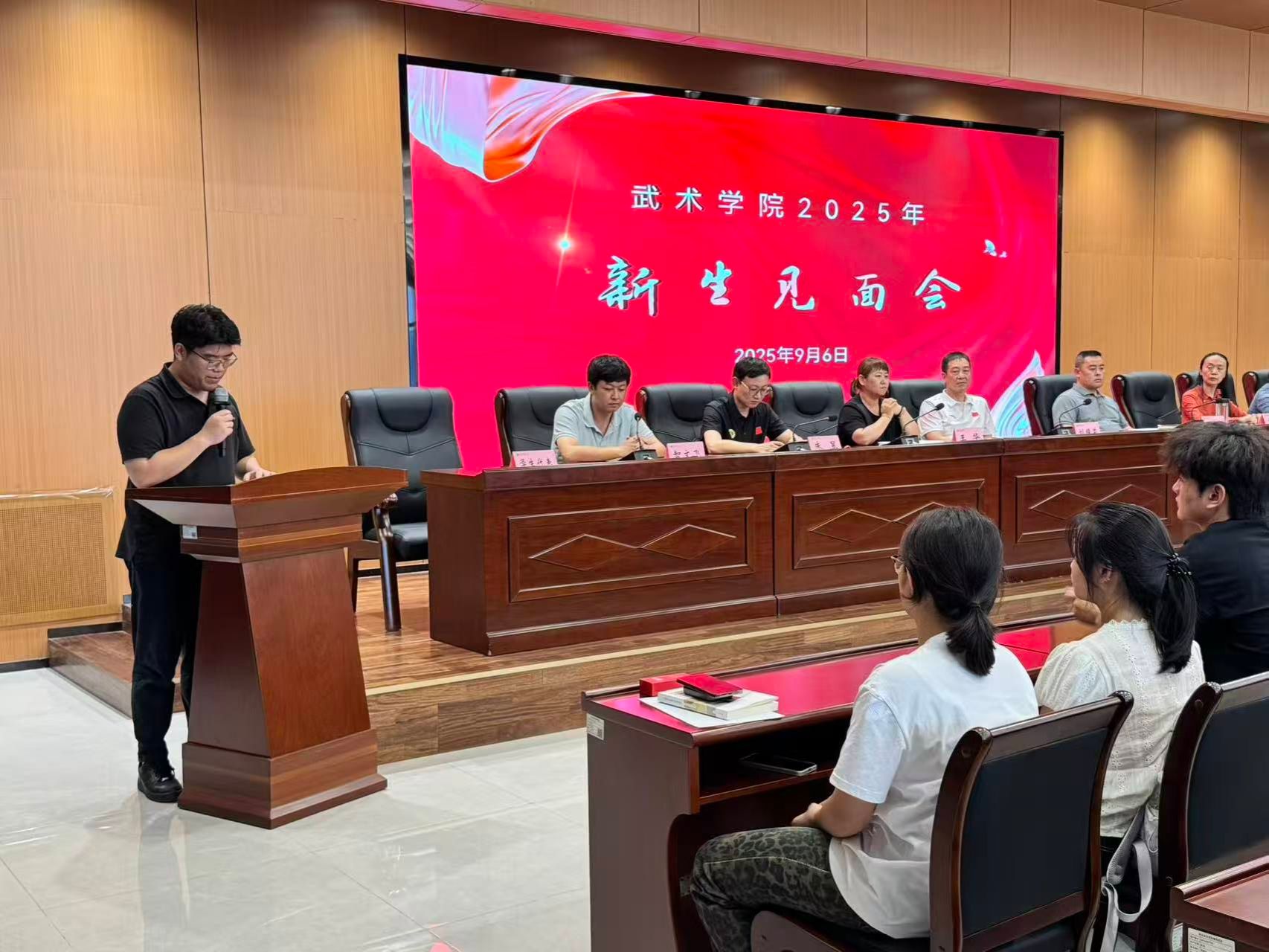 2025年9月6日,武术学院在鄠邑校区行政综合楼541会议室召开了新生见面会,武术学院院长袁金宝、总支书记刘耀荣、学院各办公室、教研室主任及支部书记参加。会议由2025级辅导员智文飞主持