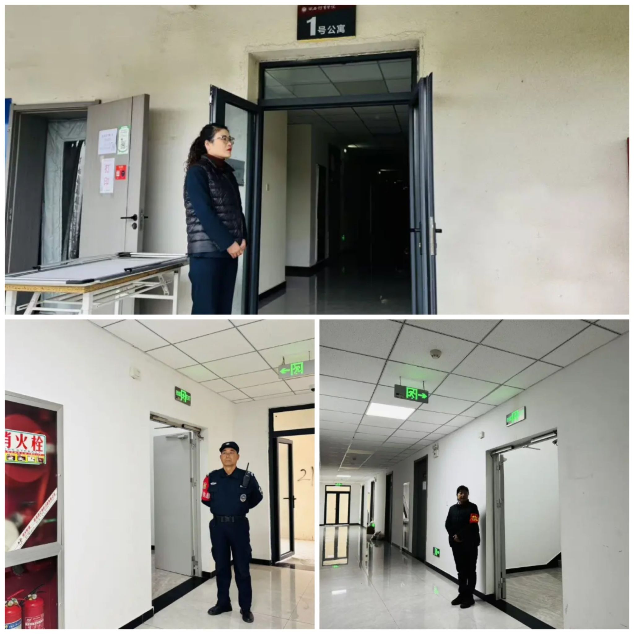 演练地点于1号学生公寓(一楼大厅四个门全开)餐厅东侧,餐厅南侧。