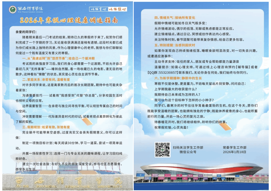 随着期末最后一门考试的结束,期待已久的寒假终于来了。祝贺你们顺利完成了一个学期的学习,无论是收获满满还是稍有遗憾,这段时光都已成为你们成长路上独特的风景。作为心理健康中心的老师,我想与你们聊聊如何度过一个既有温度又有意义的寒假。