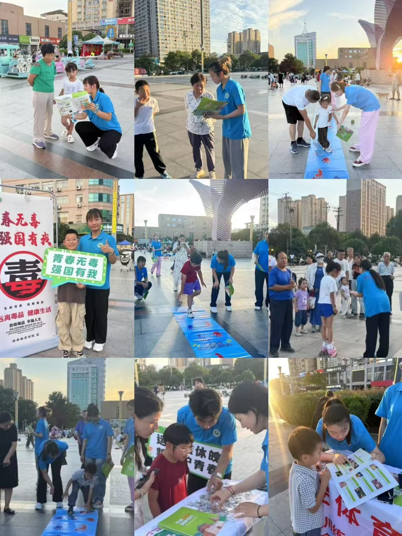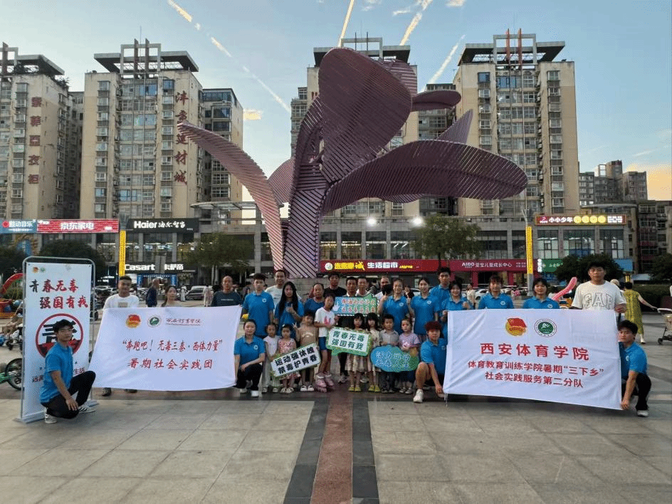 鄠邑区人民广场的中央,一串 “青春无毒,强国有我” 的宣传立牌在风里招展。夕阳将西安体育学院体育教育训练学院暑期“三下乡”社会实践服务第二分队桌子染成暖金色,夕阳将西安体育学院实践队的蓝色帐篷染成暖金色,余晖中,仍有不少结束一天忙碌、来赶晚市的居民围聚于此。