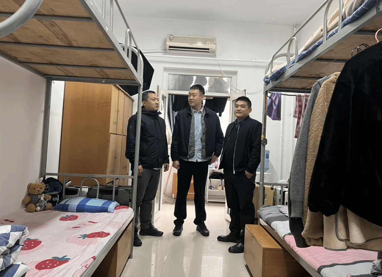 最后,宋耀伟等人前往实习生宿舍,实地查看住宿环境与生活保障情况。从床铺整理、物品摆放,到水电设施、供暖情况,并叮嘱大家要注意用电安全、保持宿舍整洁,在集体生活中相互照顾、共同进步。当实习检查老师看到宿舍环境整洁有序、生活物资齐全时,对经开二中的后勤保障工作表示认可,也欣慰于实习生良好的生活习惯。