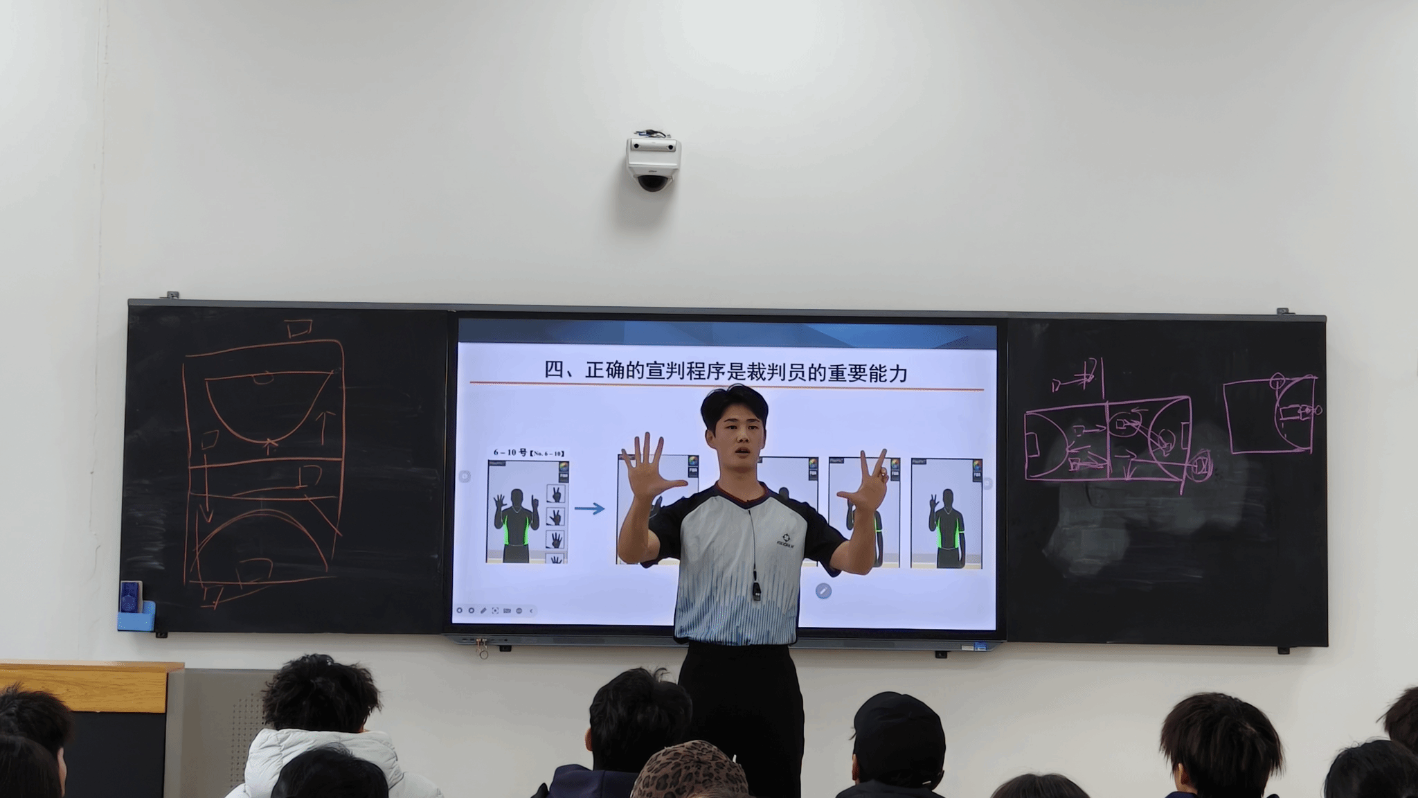 为进一步提升体育教育专业2025级班级篮球赛事执裁水平,提升校园篮球赛事的组织与裁判工作,营造更加公平、有序的班级篮球比赛环境。2025年12月23日中午在教学楼102教室,体育教育专业开展朋辈励学共成长(第十四期)篮球规则及手势培训活动,本次活动邀请体育教育专业2023级篮球一级裁判员牛浩同学作培训交流。体育教育专业2025级全体篮球赛事执裁志愿者40余人参加本次培训,培训交流会由朋辈励学副社长周佳佳主持。