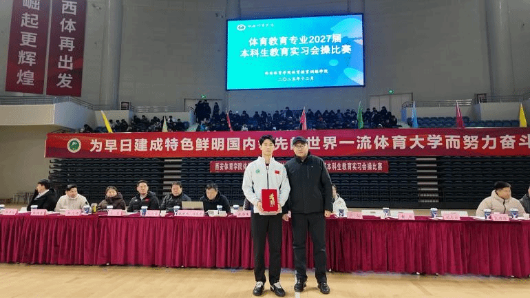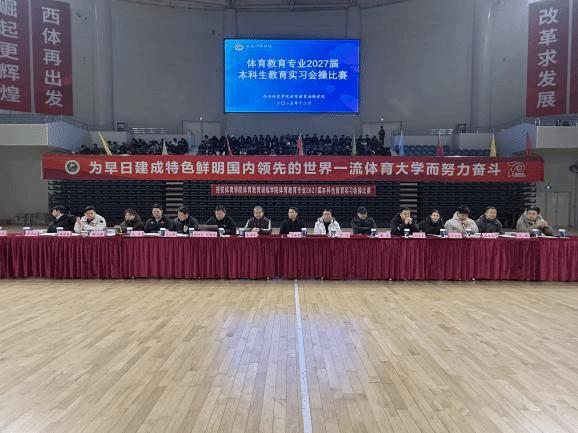 为深入贯彻落实体育教育专业人才培养要求,强化体育教育专业学生教学基本功训练,全面检验校内教育实习效果,2025年12月31日12:30,体育教育训练学院在鄠邑校区手球馆隆重举行体育教育专业2027届本科生教育实习会操比赛。校党委副书记、学院院长马海涛、学院党委书记卢喆、学院副院长武洛生、学院党委副书记黄岗、体操教研室主任、本次比赛裁判长冯俊彦以及各位评委老师出席本次活动。参加本次活动的还有校内实习指导教师、党政办公室主任、教学秘书、体育教育专业全体辅导员和全体同学们,比赛由体育教育训练学院年级主任宗月民主持。