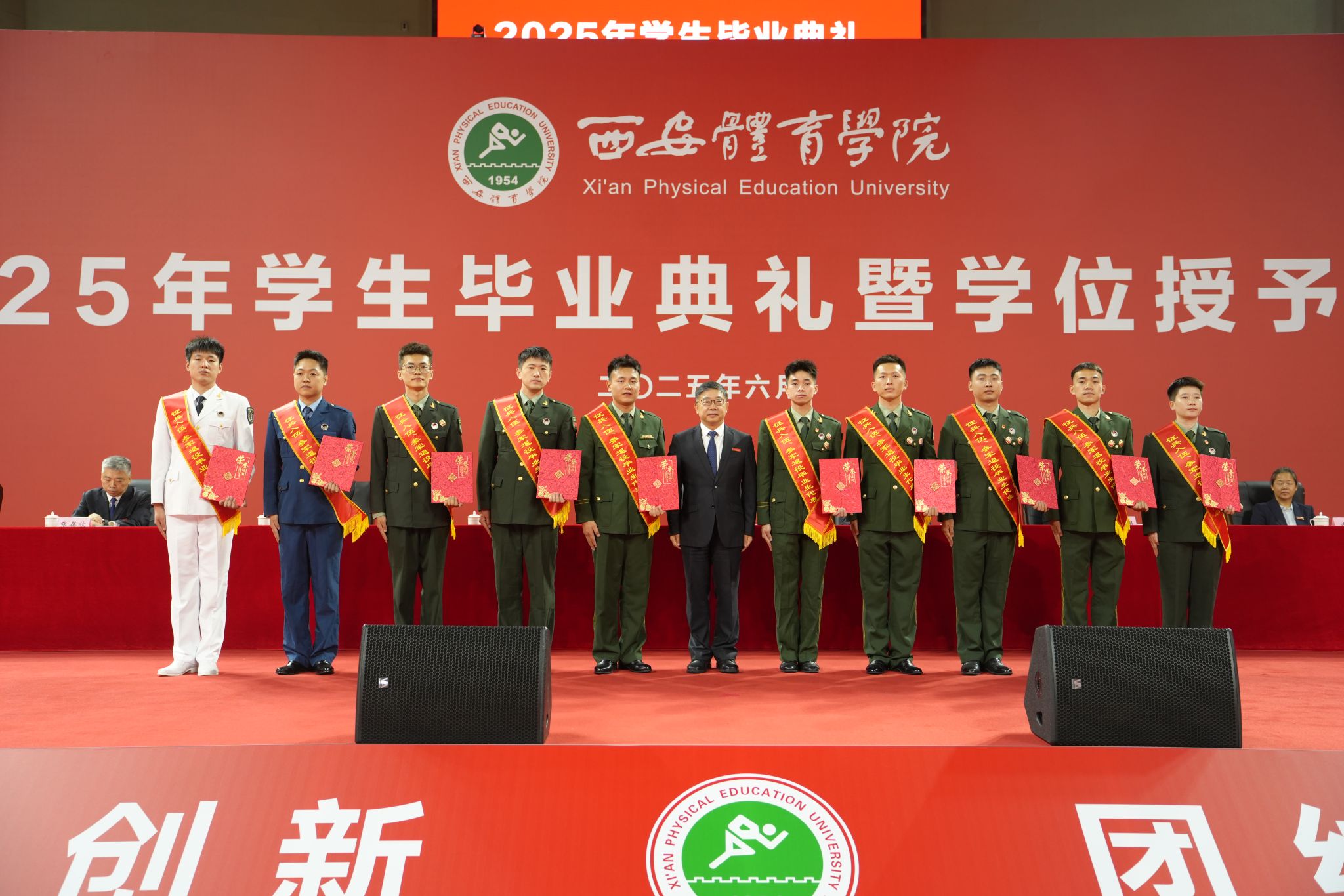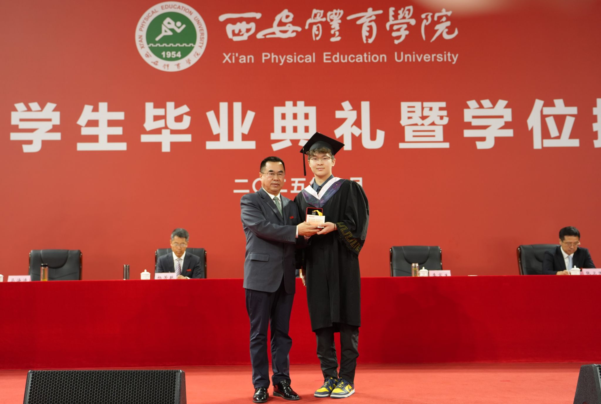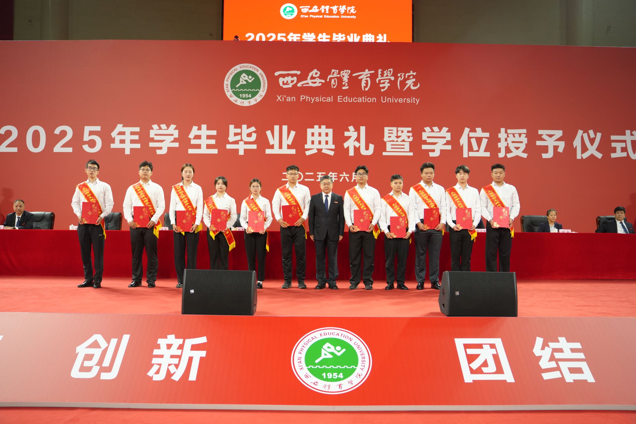 党委副书记、纪委书记、监察专员杨芳乾为优秀学生干部及优秀毕业生代表颁发荣誉证书。副校长雷振华宣读《关于聘任西安体育学院2025届校友联络大使的决定》,张卫国为2025届校友联络大使代表发放聘书。