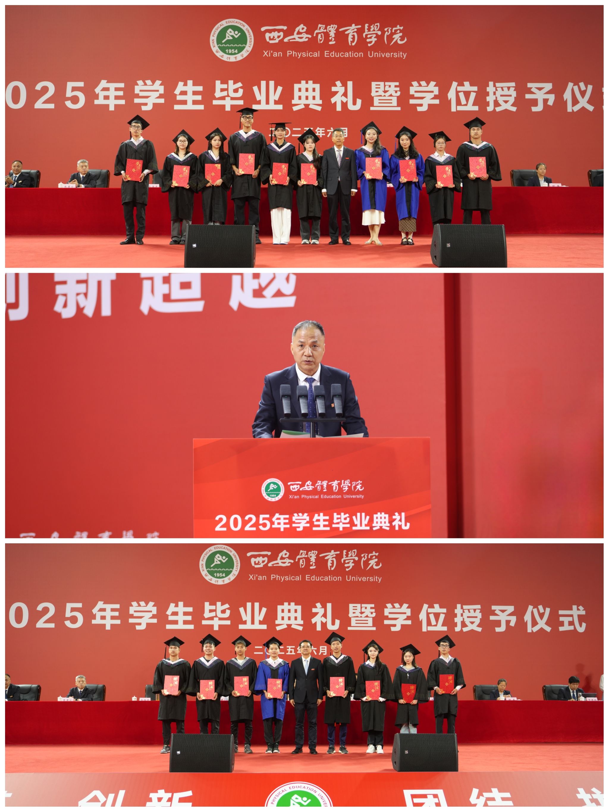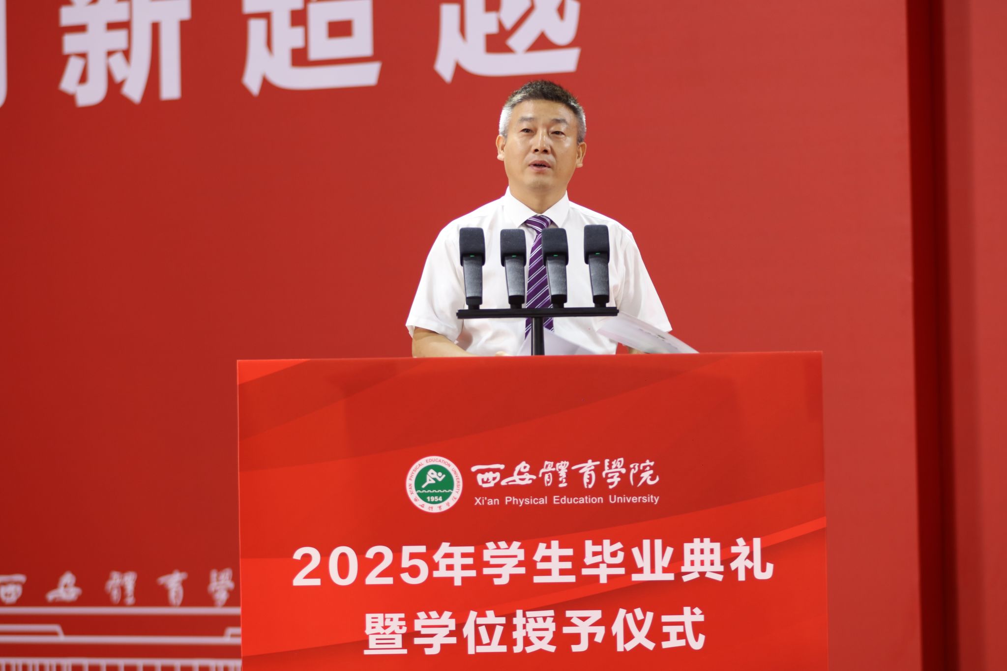 副校长张葆欣宣读《西安体育学院关于授予2025届普通本科生学士学位的决定》,副校长谢英宣读《关于授予2025届研究生硕士学位的决议》。副校长毕德鹏宣读《关于2025届西安体育学院优秀毕业生、优秀学生干部的表彰决定》。