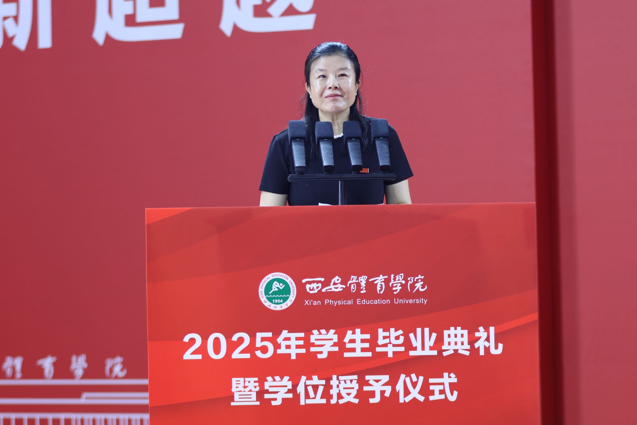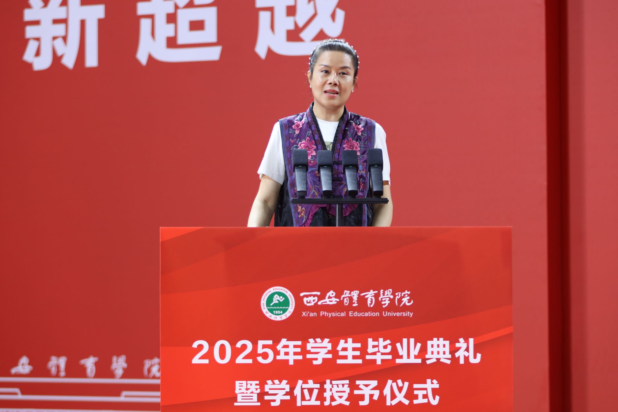 运动与健康科学学院潘玮敏教授作为教师代表,感谢毕业生为西安体育学院注入的鲜活生命力,鼓励同学们以创新训练的方法探索,以实践精神去开拓,以独立思考去钻研,找准对应时代变革的核心秘密,在新兴体育产业中找准定位,快速成长,无限突破。