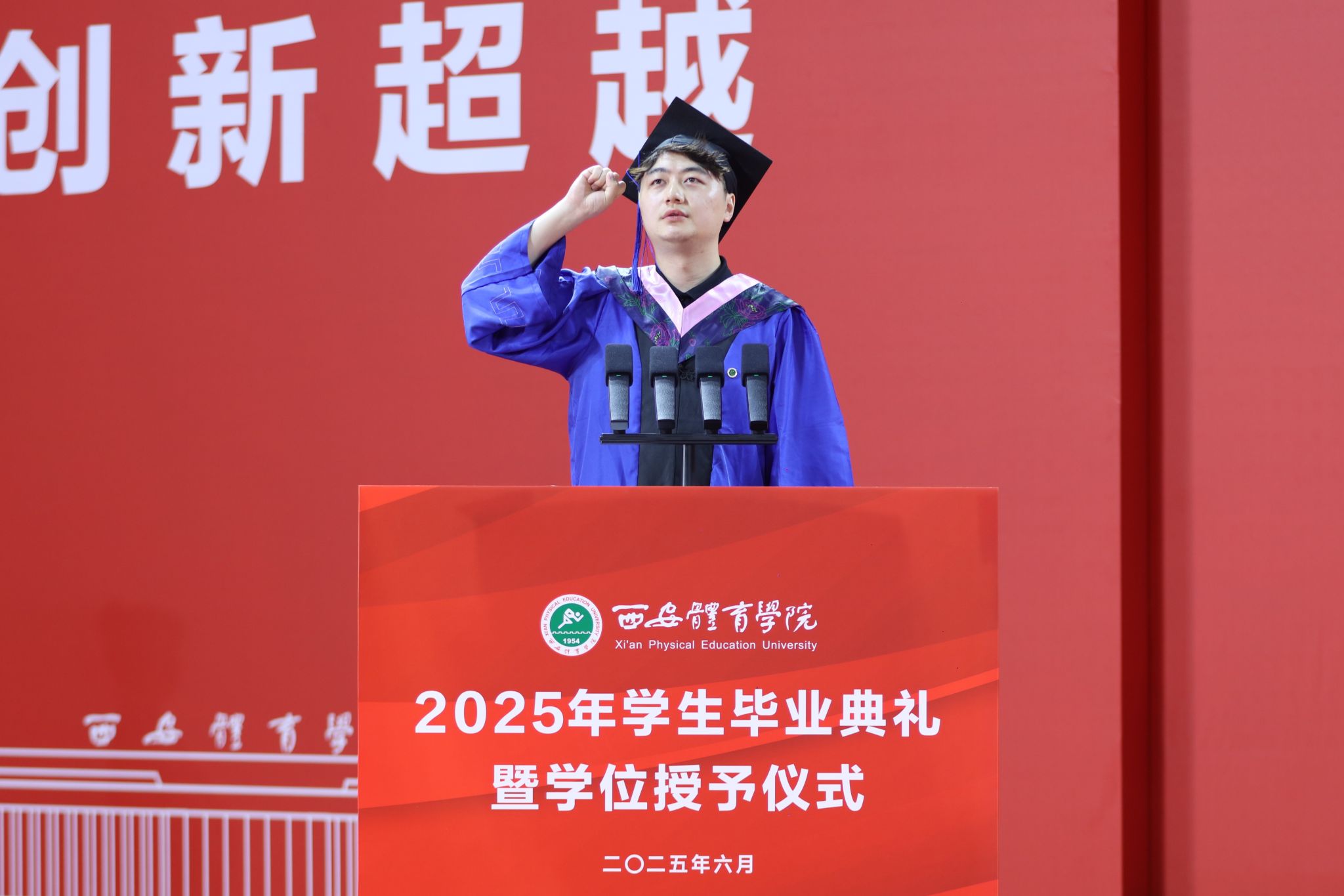 2025届体育人文社会学专业毕业生陈鑫带领全体毕业生庄重宣誓:全体毕业生们将铭记“严谨创新 团结拼搏”的西体校训,坚定“兴体报国 勇当先锋”的远大理想,肩负“请党放心 强国有我”的使命担当。感恩母校培养,永葆赤子之情,为实现中华民族伟大复兴,贡献自己的青春和力量!
