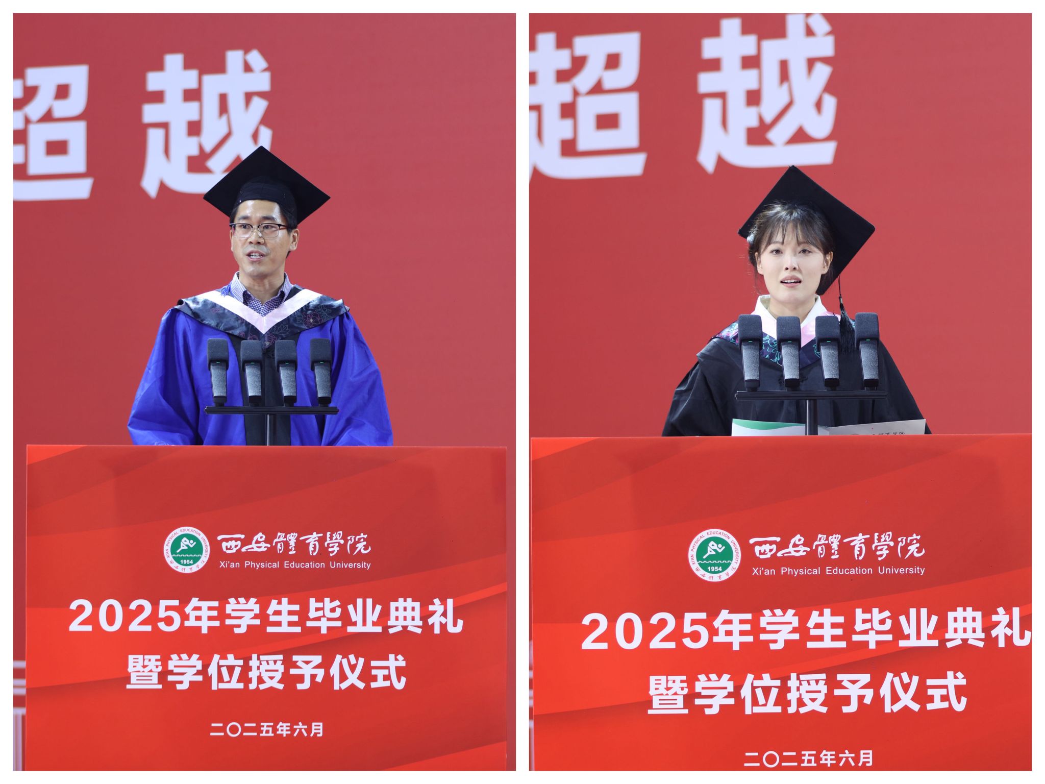 来自研究生部运动训练专业22级的宋业猛和体育教育专业21级的张媛媛分别代表2025届硕士毕业生和本科生发言,他们深情回顾西体求学生涯,感谢学校给予的实践探索与学术科研的多元发展平台,感恩师长们无微不至的关怀,表示将以体育精神为灯塔,在人生新征程中不懈奋斗,并衷心祝愿母校蓬勃发展、再创辉煌!